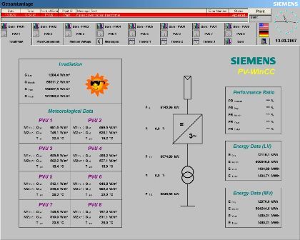 WinCC 使得电站的能量流变得透明,它可以显示当前状态、消息、测量数据和报告。电站中产生的数据会自动得到组织,并每隔一秒保存在 Microsoft SQL Server 2005 Archive 中。您可以保有电站中发生的所有事件和测量数据的符合要求的完整记录证明。光伏电站与 WinCC 终端之间的通讯可通过以太网快速、安全地进行。