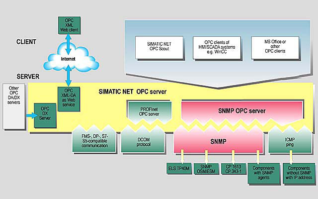 SNMP OPC 服务器软件为所有的SNMP设备提供诊断和配置。该OPC服务器使用SNMP协议来执行SNMP设备的数据交换。所有的信息可以被集成到OPC兼容的系统中,如WinCC HMI系统。这使得过程和网络诊断可以结合到HMI系统中。