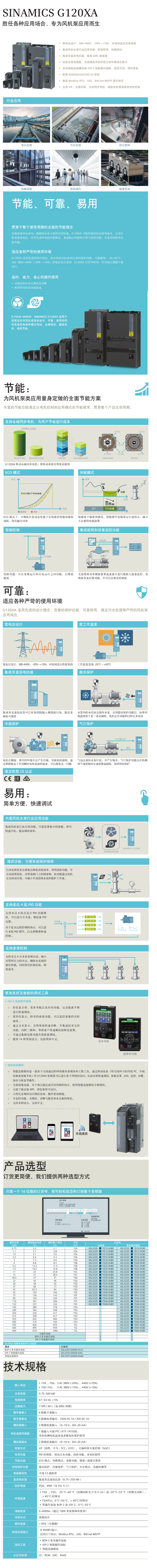 SINAMICS G120XA是西门子SINAMICS系列变频器的新成员,功率范围覆盖0.75 kW~560 kW,内置风机和水泵行业应用功 能,汇集了优异的高性能矢量控制算法,可以轻松的驱动风机、水泵及压缩机等负载。