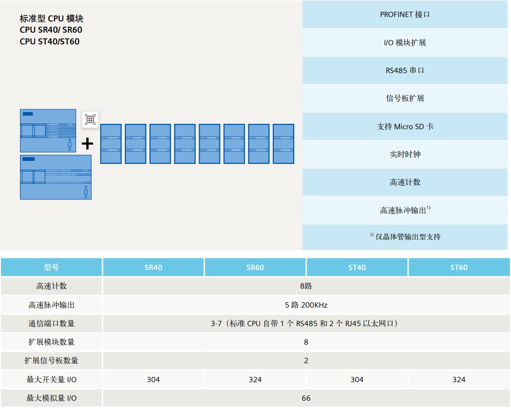 全新 S7-200 SMART CPU V3.0 模块,可全方位满足不同行业、不同客户、不同设备的各种需 求。SR/ST 标准型 CPU 可扩展 8 个扩展模块和 2 个信号板,适用于 I/O 点数较多,逻辑控制较 为复杂的应用。