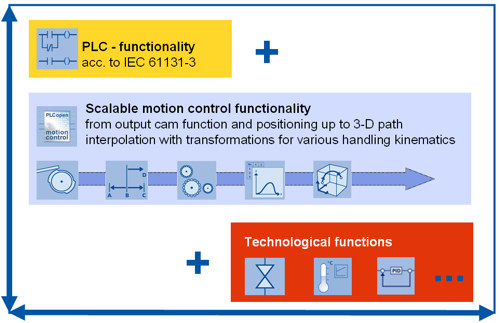 每个工艺功能包都提供了相关工艺的完整功能。例如,“运动控制”工艺功能包提供了精确定位以及凸轮盘同步所需所有功能,包括与驱动器间的循环设定点和实际值替换、位置控制、运动曲线计算、运动替换或叠加、参考功能、编码器切换、轴使能、状态信息等。除运动控制工艺功能包(包括定位、同步、凸轮盘、路径插补)外,还提供了用于其它工艺功能(如温度控制)的功能包。
